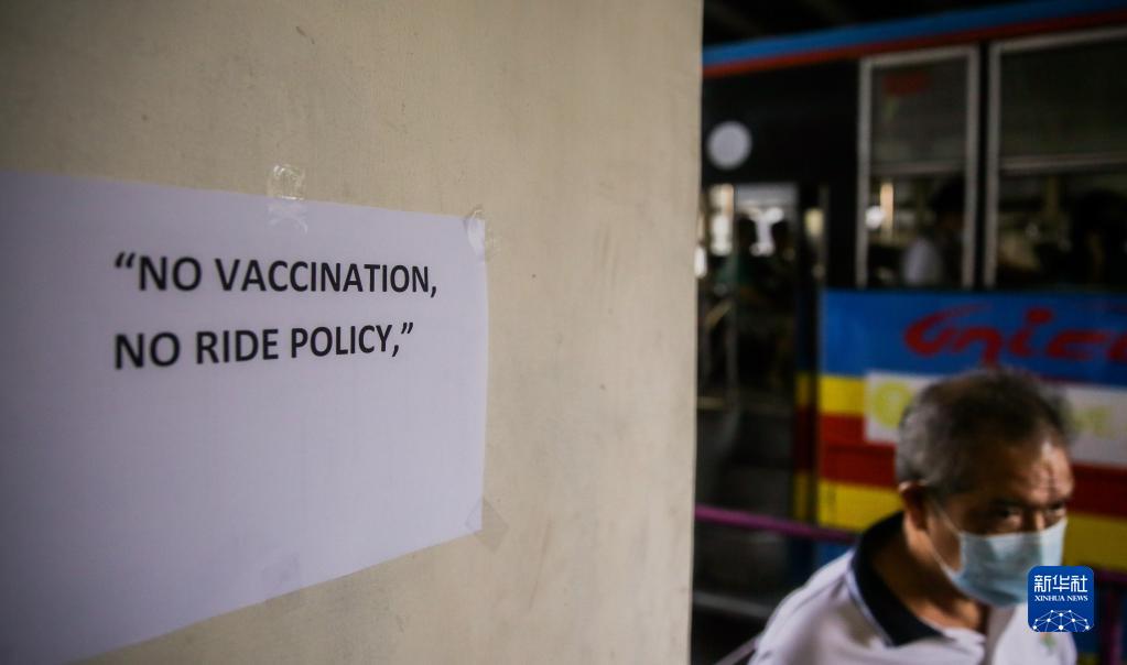1月17日,菲律宾奎松城的公交车站张贴着“未接种疫苗者不得乘车”的告示。