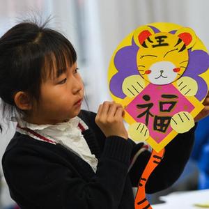 1月18日,在呼和浩特市苏虎街实验小学,一名学生在寒假托管美术课程上展示手工制作的虎年挂饰。