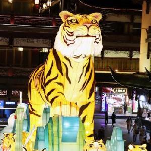 当晚,上海豫园商城中心广场上高约9米的“虎跃东方”生肖虎巨型灯组正式亮灯,整个豫园张灯结彩,喜气洋洋迎接新春。