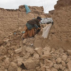 1月18日,在阿富汗西部巴德吉斯省卡迪斯地区,当地居民站在房屋废墟中。