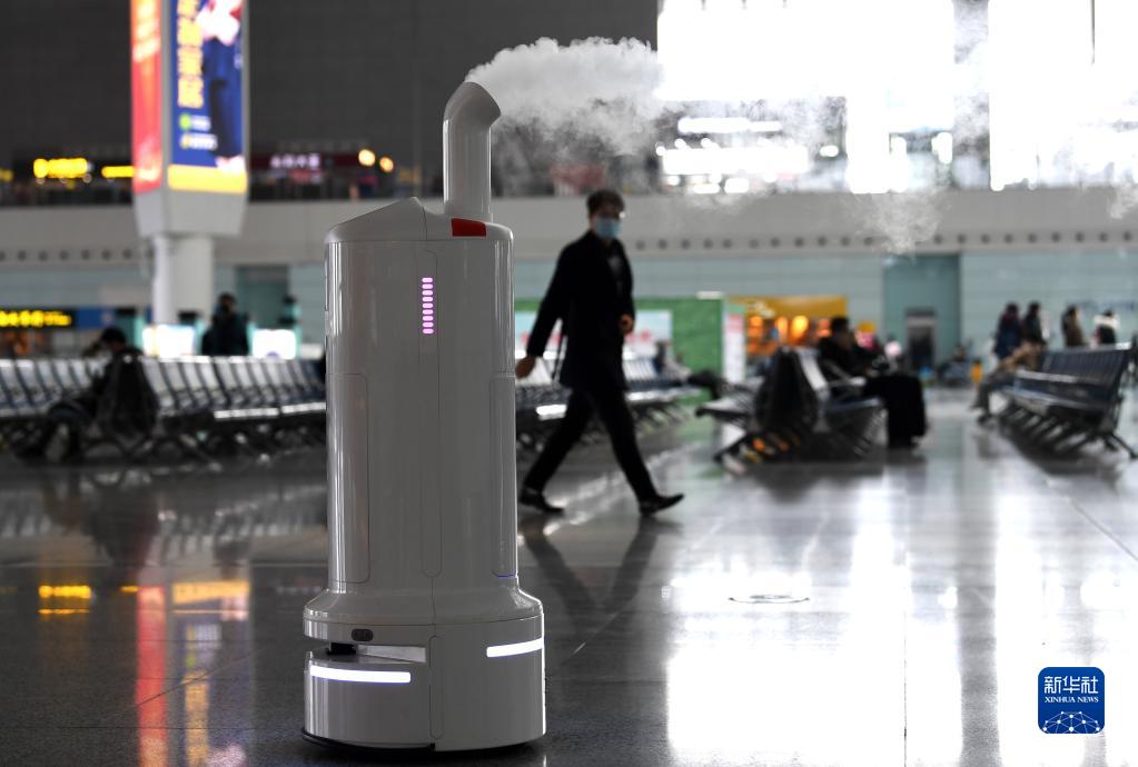 1月18日,空气环境自动消毒机器人“小创”在合肥南站通过自动识别路径进行喷洒消毒。