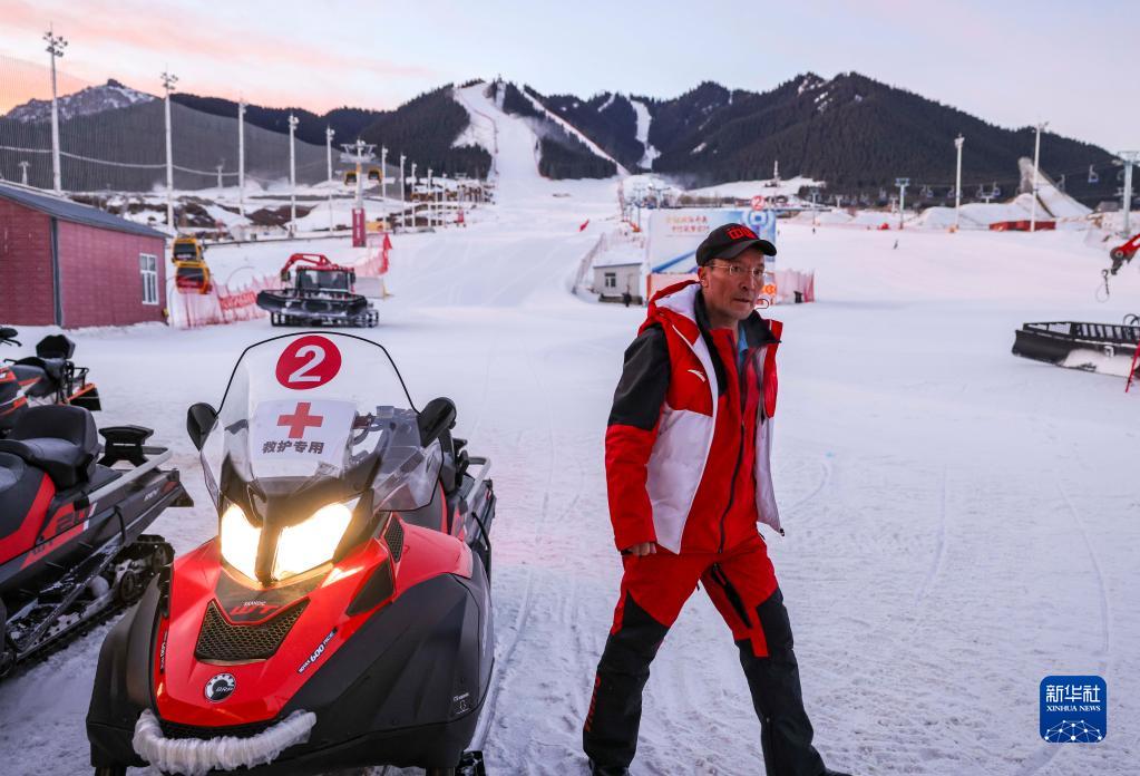 在新疆丝绸之路国际度假区滑雪场,塔里哈提·散塔依预热雪地摩托后,走向办公室(1月10日摄)。
