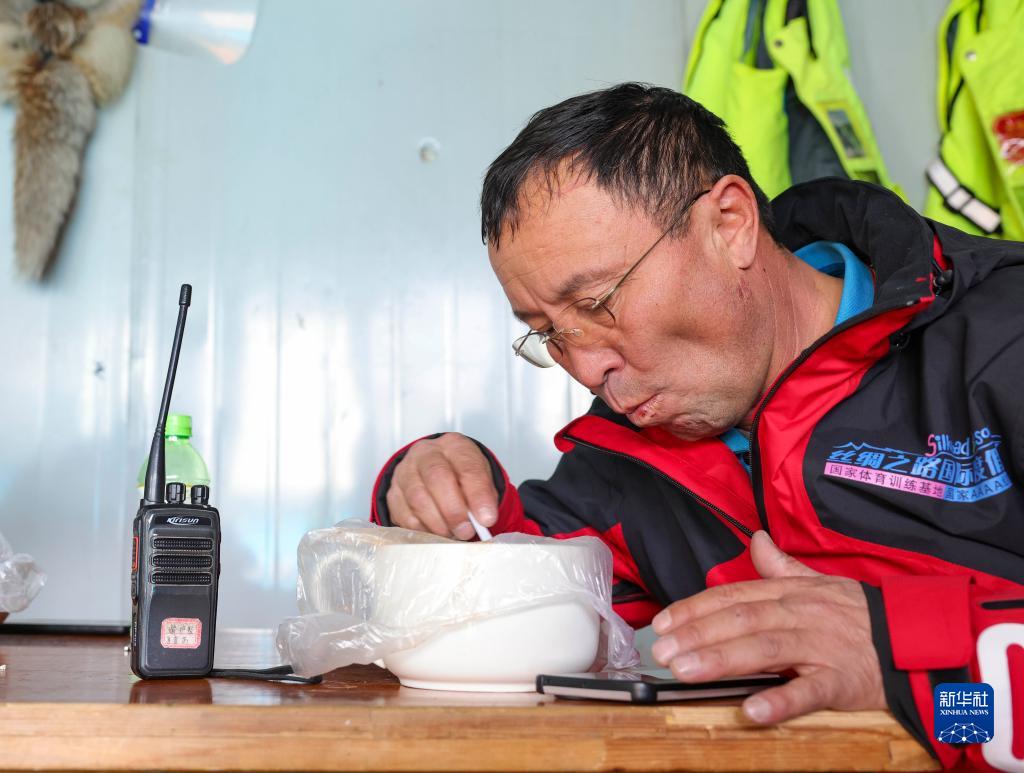 塔里哈提·散塔依边吃午饭边翻看手机上的巡道汇报信息(1月11日摄)。