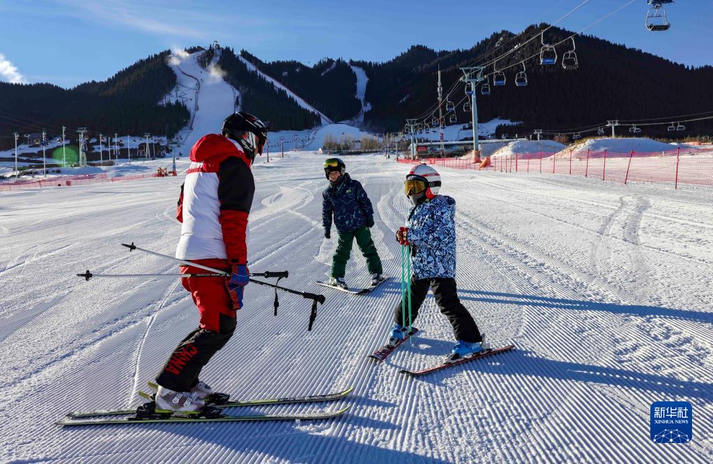在新疆丝绸之路国际度假区滑雪场,巡道中的塔里哈提·散塔依(左)碰到正在滑雪的儿子(右)(1月10日摄)。