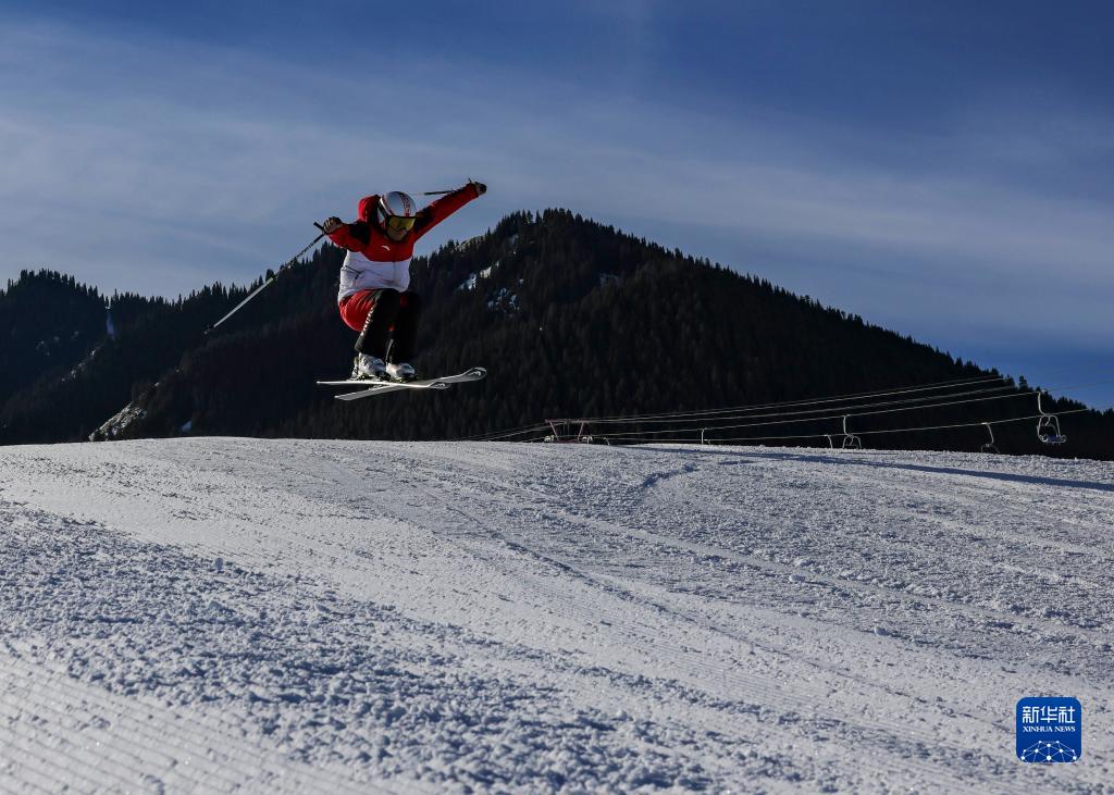 塔里哈提·散塔依在新疆丝绸之路国际度假区滑雪场内滑雪(1月11日摄)。