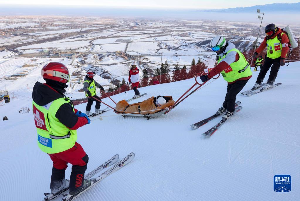 在新疆丝绸之路国际度假区滑雪场艾文大道上,塔里哈提·散塔依(左三)指挥同事进行救援演练(1月11日摄)。