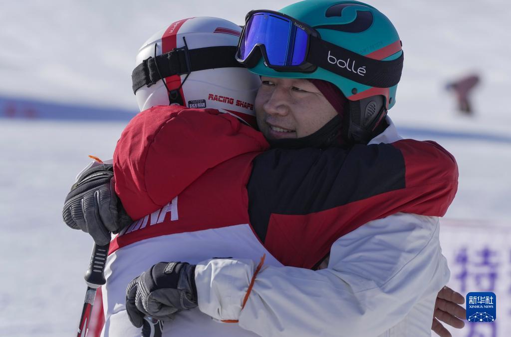 曾被救援的雪友马东旭(右)与塔里哈提·散塔依拥抱致意(1月11日摄)。