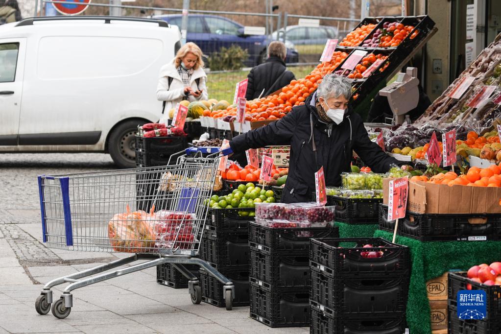 1月19日,在德国首都柏林,一名顾客在一家水果店购物。