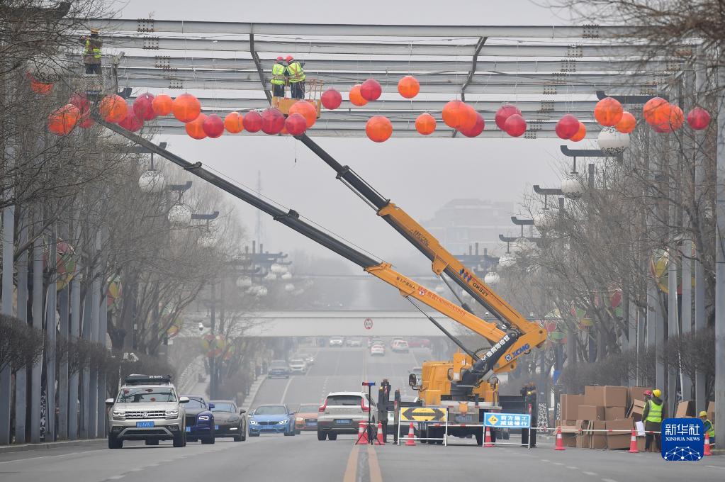 1月20日,在西安市曲江池北路上,工人在安装彩灯。新华社记者 邵瑞 摄