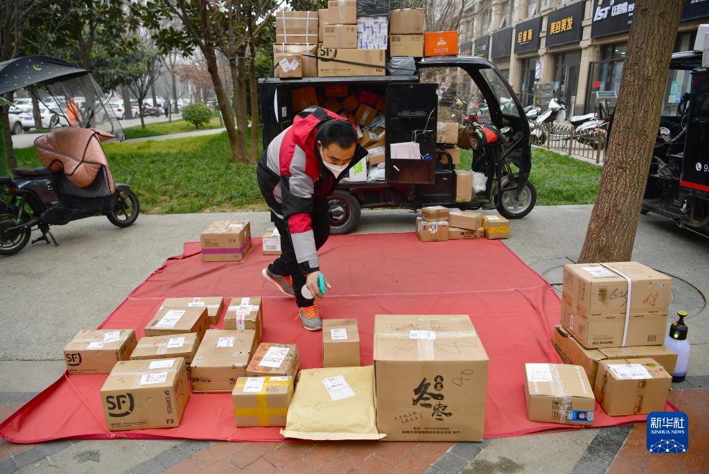 1月20日,在西安市曲江新区一小区外,快递人员在对快递包装消毒。新华社记者 邵瑞 摄