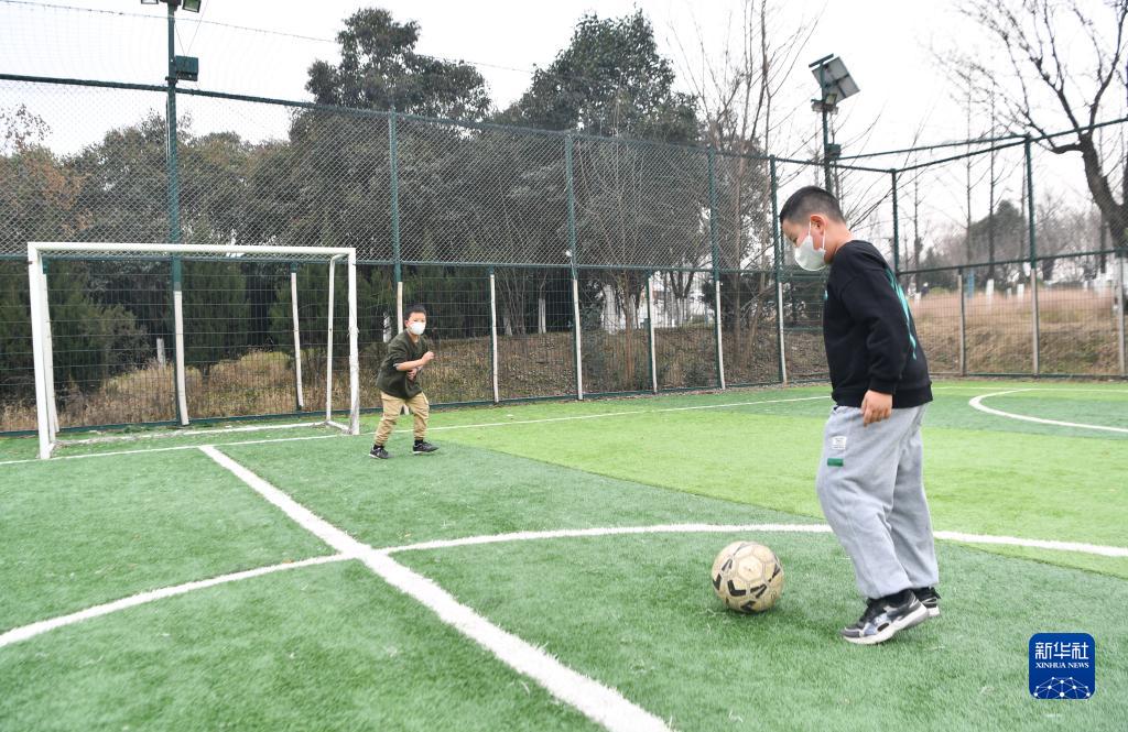 1月20日,小朋友在西安浐灞生态区一处公园内踢球。新华社记者 张博文 摄
