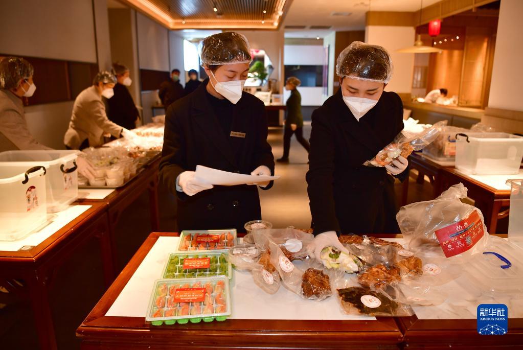 1月20日,在位于西安市曲江新区的西安饭庄大唐不夜城店内,工作人员根据订单打包食品。新华社记者 邵瑞 摄