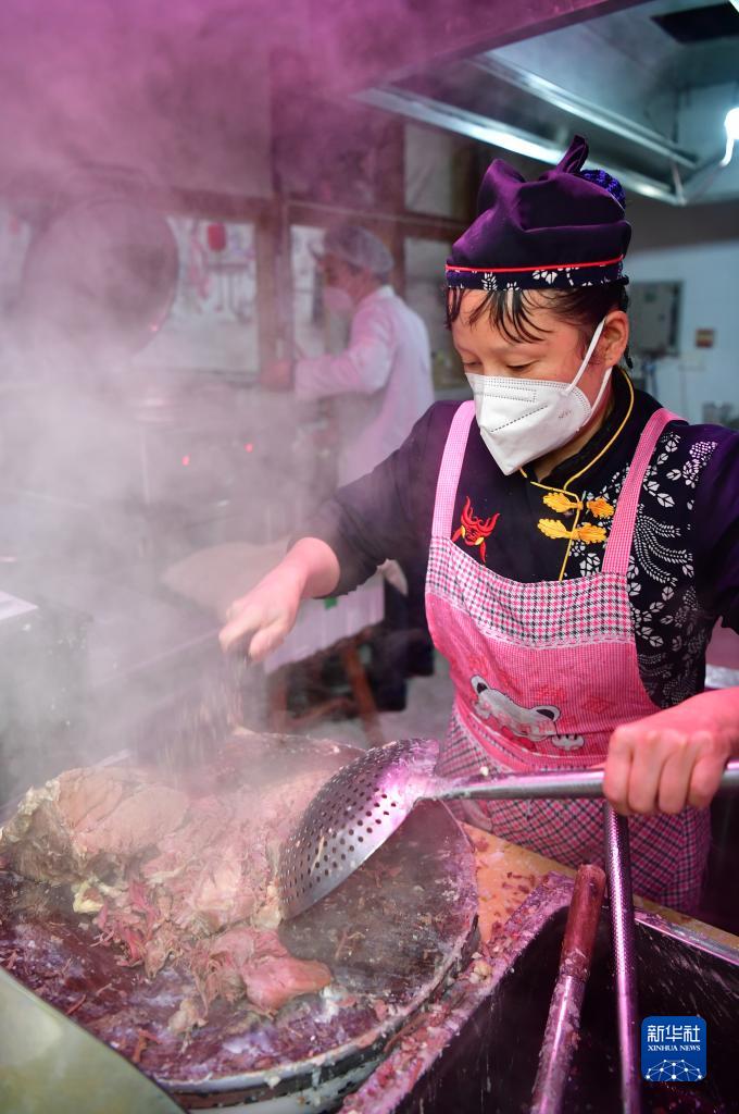 1月20日,在西安市曲江新区一家小吃店内,工作人员在制作肉夹馍。新华社记者 邵瑞 摄
