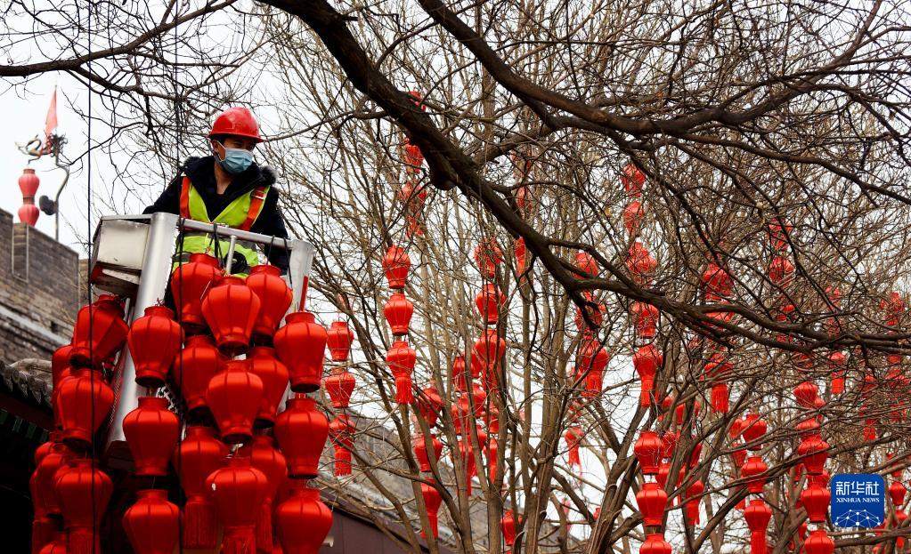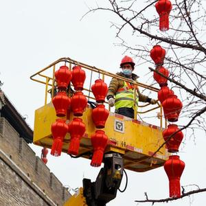 1月20日,工作人员在西安城墙景区外安装灯笼。新华社记者 刘潇 摄
