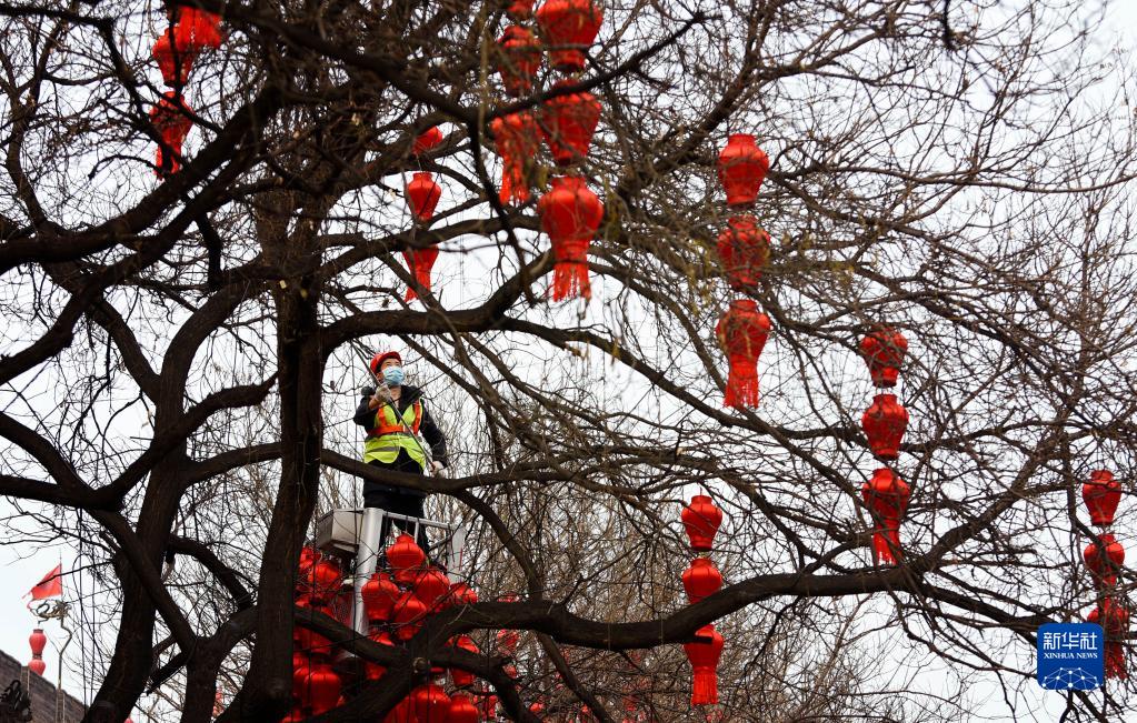 1月20日,工作人员在西安城墙景区外安装灯笼。新华社记者 刘潇 摄