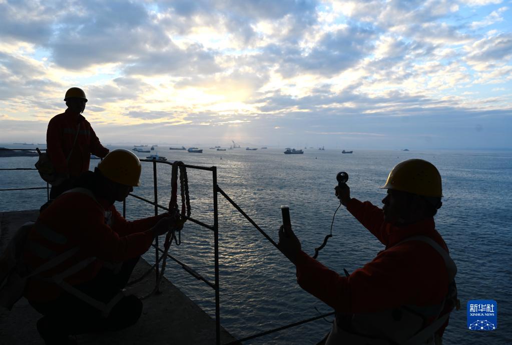 1月19日,中国铁路南昌局集团有限公司福州工务段平潭路桥养修工区工长郑华(右一)和工友们在平潭海峡公铁大桥上测量风速。新华社记者 林善传 摄