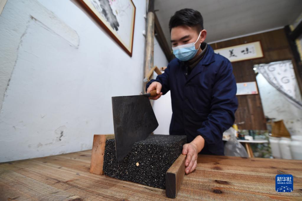 在黄山市徽州区岩寺老街,当地居民在切芝麻糖(1月19日摄)。新华社记者 周牧 摄