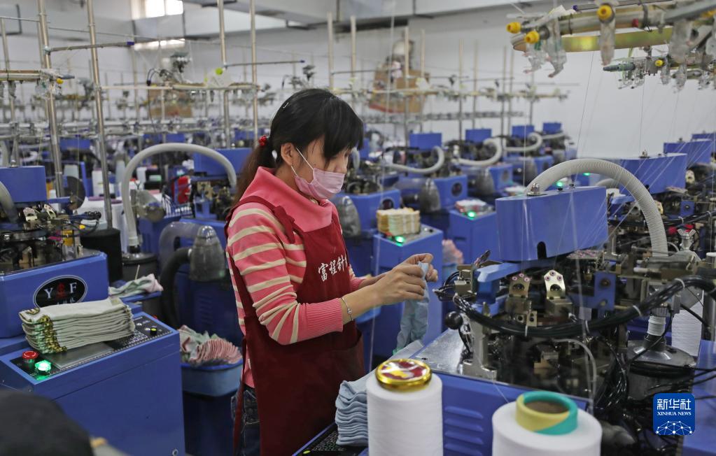 在小北河镇富程针织厂,工人在生产袜子(2020年1月7日摄)。