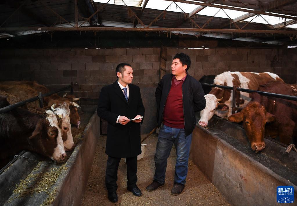 1月20日,中国农业银行重庆武隆支行工作人员(左)在武隆区双河镇石坝村了解肉牛养殖户的生产经营计划及资金需求。