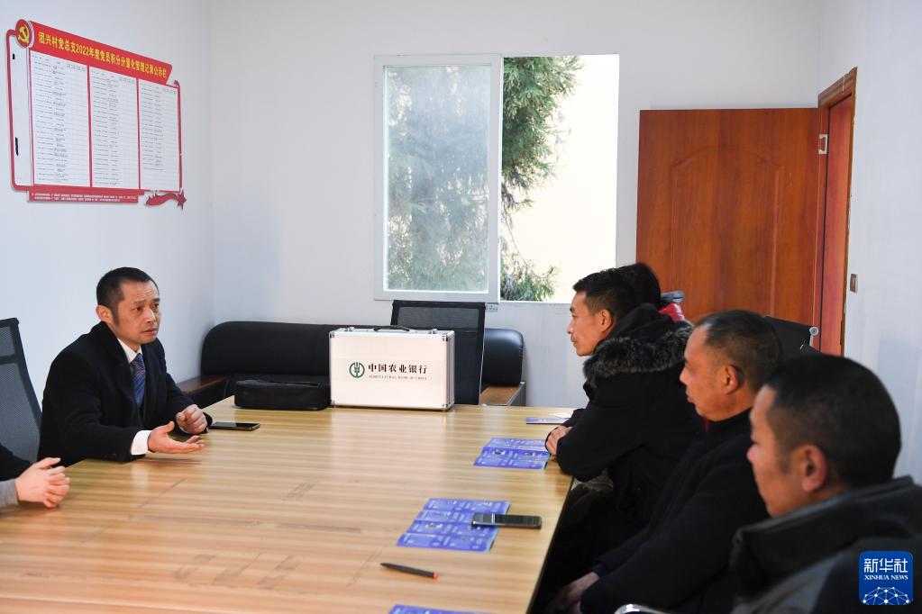 1月20日,中国农业银行重庆武隆支行工作人员(左一)在武隆区双河镇团兴村向村民介绍涉农贷款相关政策。