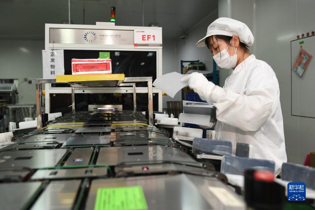 1月18日,在隆基绿能科技股份有限公司西安切片工厂,工人在进行检测包装作业。