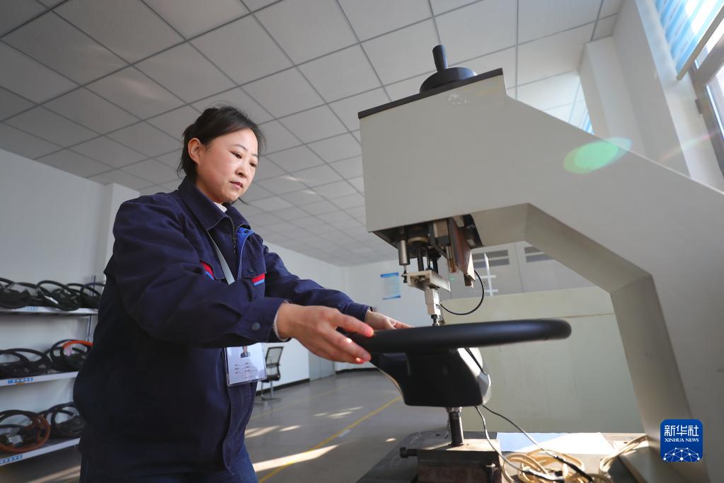 1月20日,在铁岭县新台子镇一家企业,工作人员在对汽车方向盘进行喇叭耐久性测试。