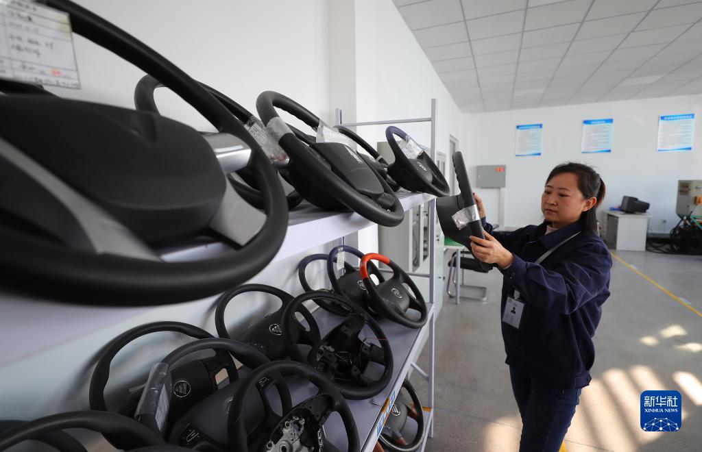 1月20日,在铁岭县新台子镇一家企业,工作人员在检查汽车方向盘外观。