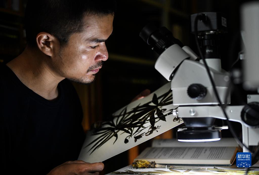 杨宗宗在工作室通过显微镜观察植物标本(2021年10月10日摄)。