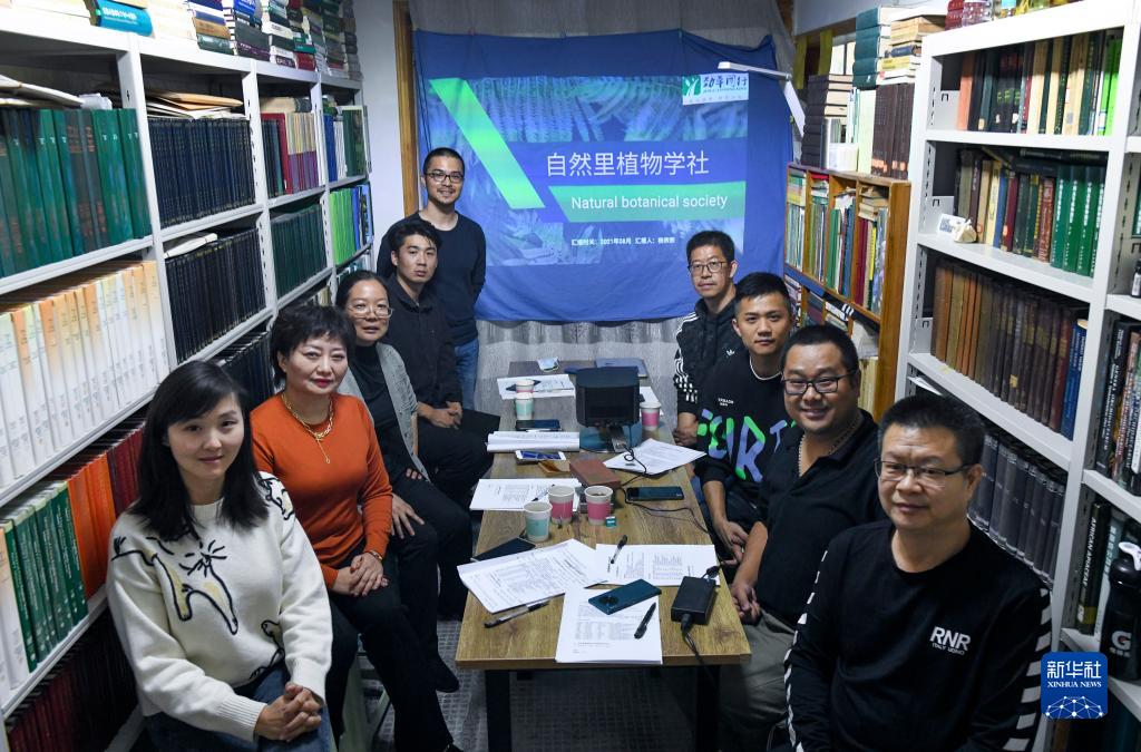 杨宗宗(左五)和自然里植物学社成员在一起(2021年10月9日摄)。新华社记者 杜刚 摄