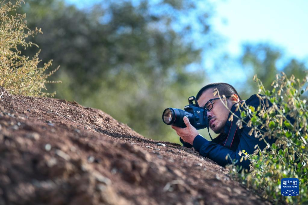 在乌鲁木齐一处山体上,杨宗宗在采集拍摄小藜(2021年10月10日摄)。新华社记者 王菲 摄