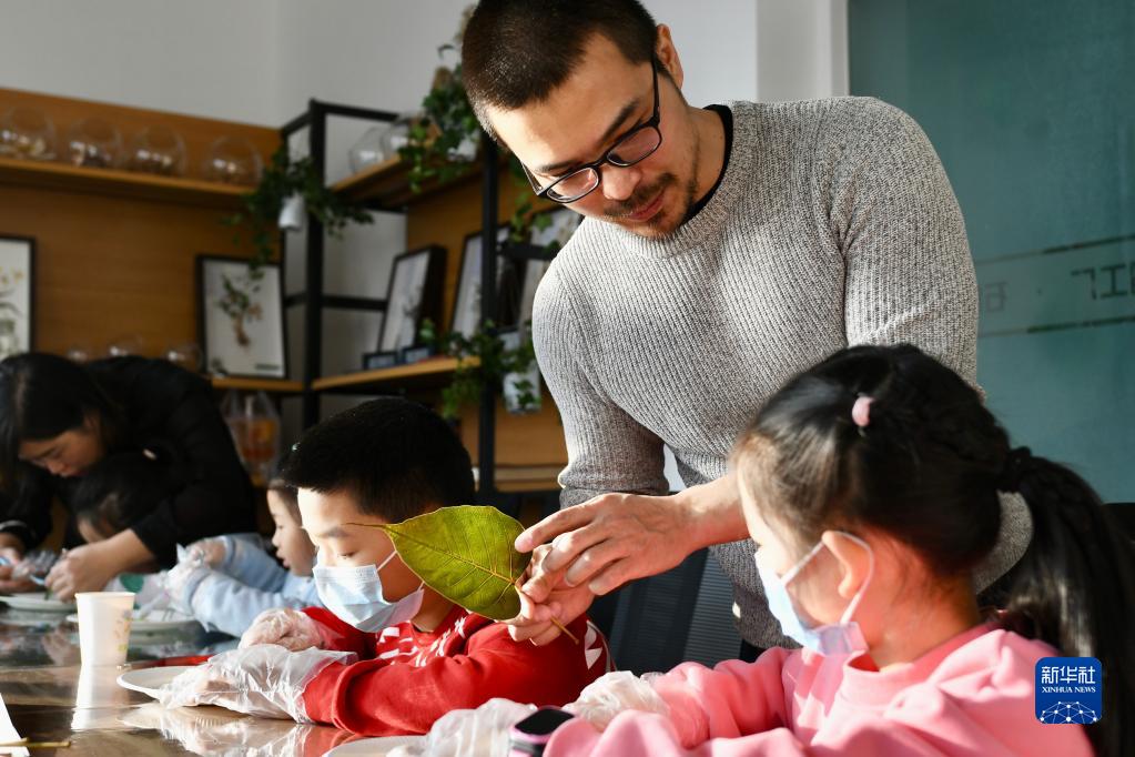杨宗宗在工作室为前来参加研学课程的小朋友讲解有关树叶叶脉的知识(2022年1月16日摄)。新华社记者 王菲 摄