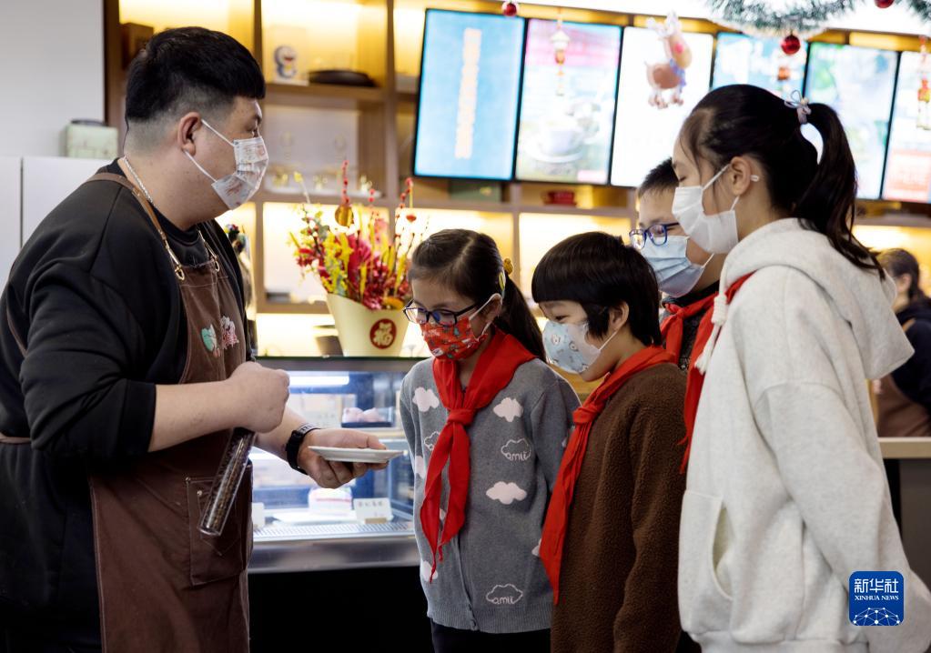1月21日,在上海市闵行区莘庄镇康城社区内的咖啡屋,放假的孩子们在了解咖啡豆的知识。