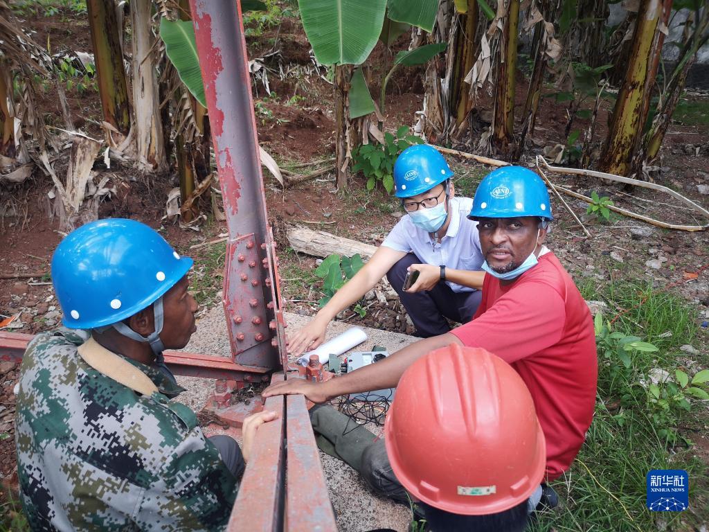 2021年12月22日,在科摩罗昂儒昂岛希玛发射台,中国援科广电技术合作组专家王春宇(中)测量铁塔接地电阻。