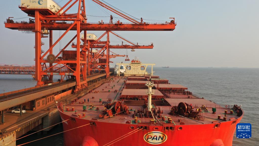 一艘轮船靠泊在唐山港曹妃甸港区矿石码头卸货(1月20日摄,无人机照片)。