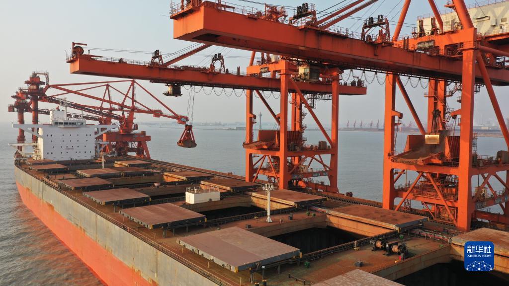 一艘轮船靠泊在唐山港曹妃甸港区矿石码头卸货(1月20日摄,无人机照片)。