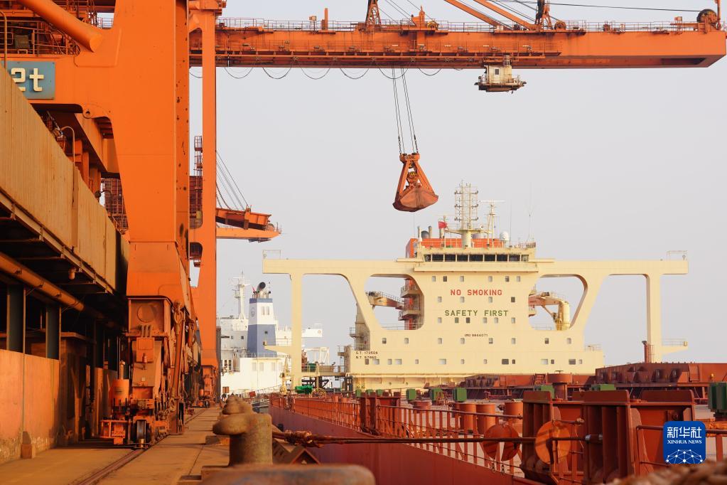一艘轮船靠泊在唐山港曹妃甸港区矿石码头卸货(1月20日摄)。