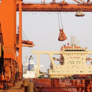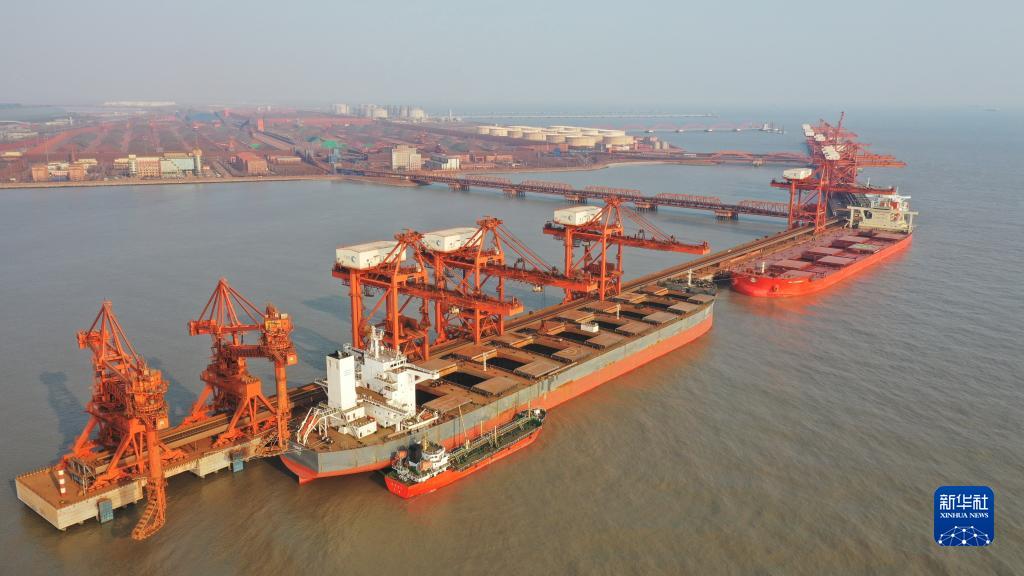 轮船靠泊在唐山港曹妃甸港区矿石码头卸货(1月20日摄,无人机照片)。