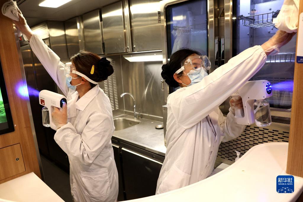 1月21日,工作人员在上海虹桥火车站手持喷雾器对高铁列车进行消毒。