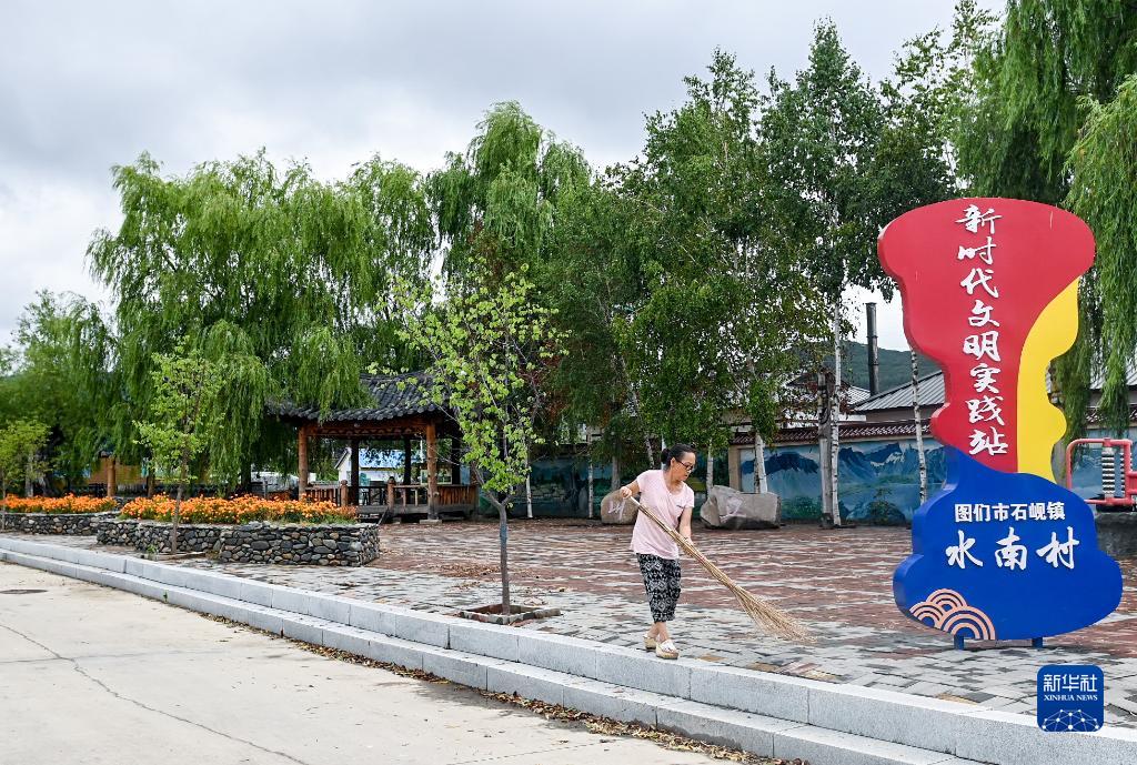 图们市石岘镇水南村村民在村内小广场打扫卫生(2021年8月3日摄)。