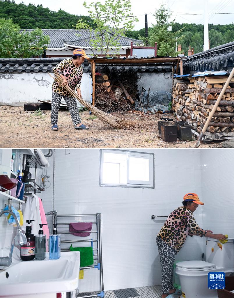 拼版照片:上图为图们市石岘镇水南村村民康顺姬在打扫院子里的旱厕旧址;下图为康顺姬在打扫室内厕所(2021年8月3日摄)。