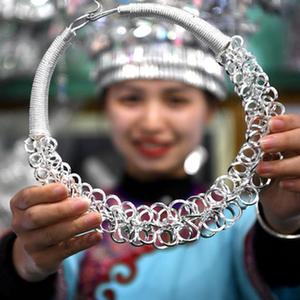 1月21日,在榕江县古州镇老街一家银饰店,一名少数民族姑娘展示自己挑选的银饰。