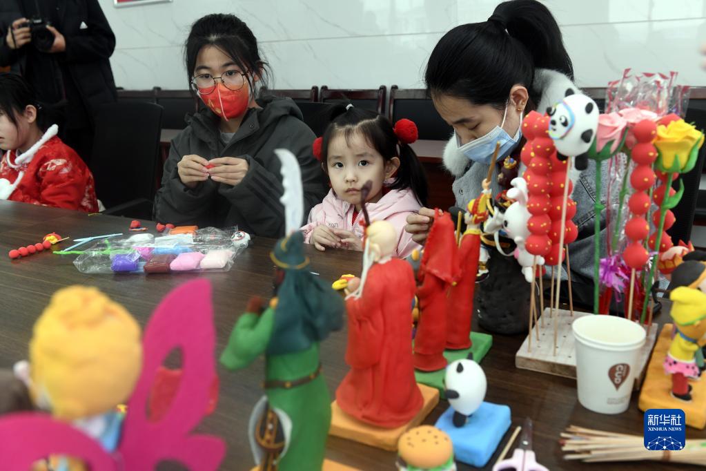 1月21日,山东省滨州市沾化区利国乡南五社区便民服务中心,家长与孩子们一起在捏面塑。