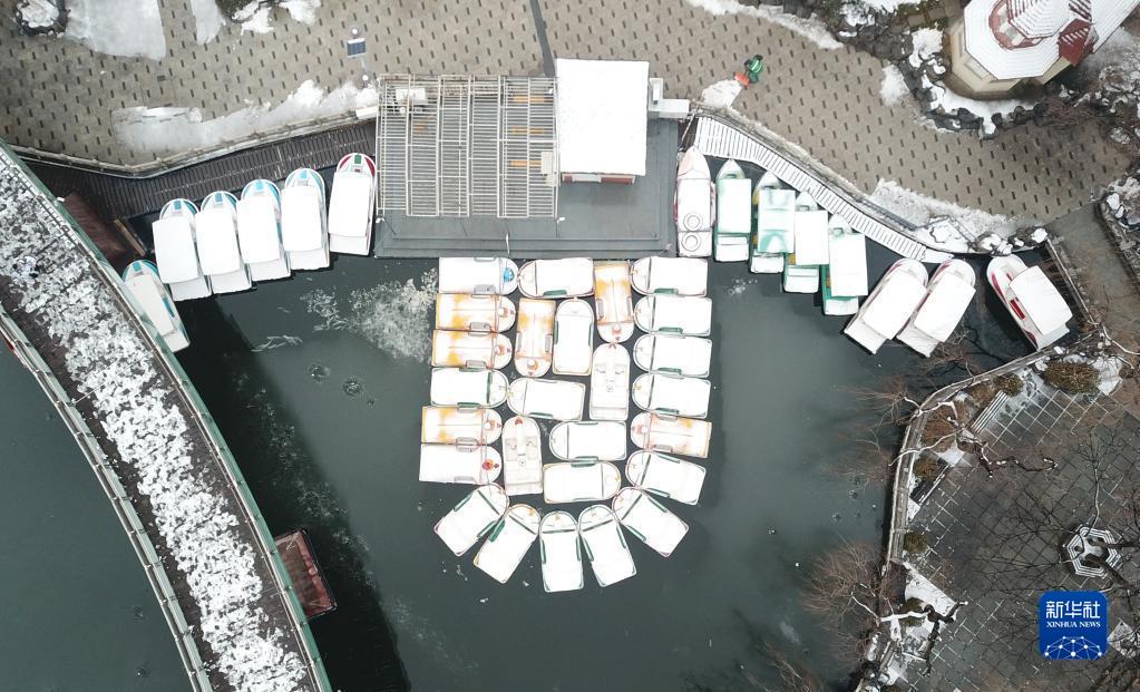 1月22日,位于济南市区的泉城公园被白雪覆盖(无人机照片)。