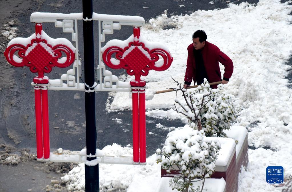 1月22日,一名市民在郑州市街头清理路边积雪。