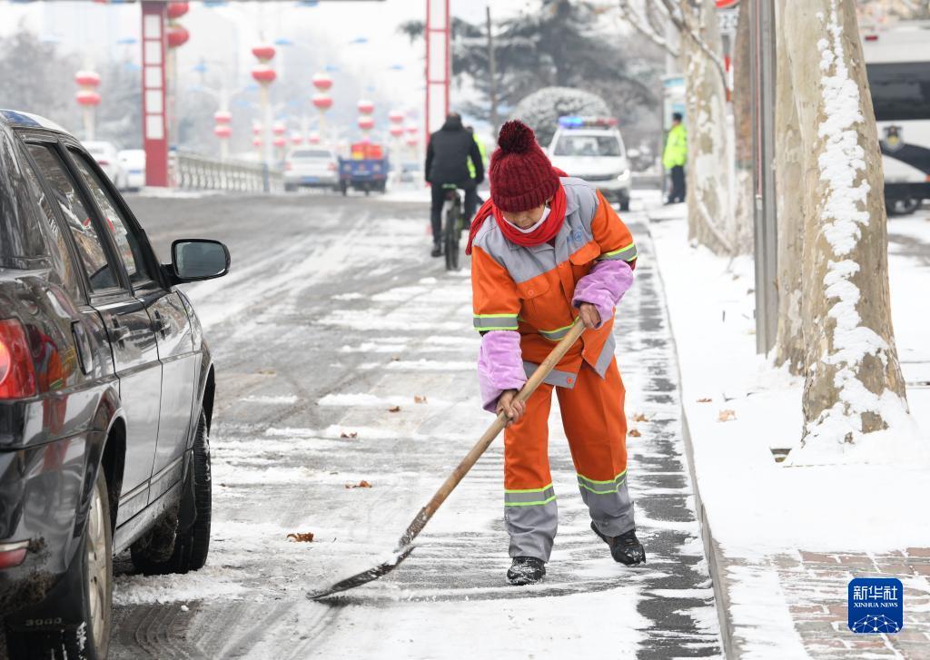 1月22日,环卫工人在河北石家庄新乐市街头清扫积雪。