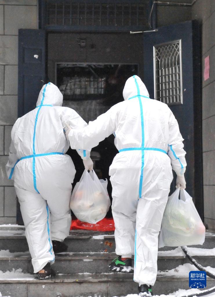 1月22日,在建安社区德宝名城小区,社区工作人员相互搀扶,为居家隔离人员配送生活物资。
