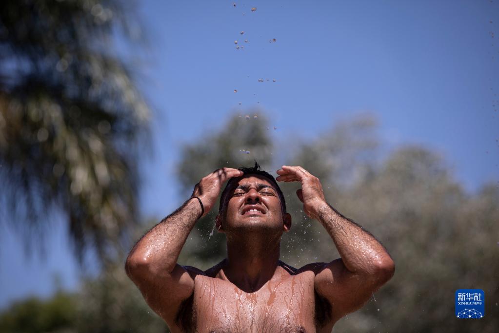 1月13日,在阿根廷首都布宜诺斯艾利斯,一名男子用水将自己淋湿降温。