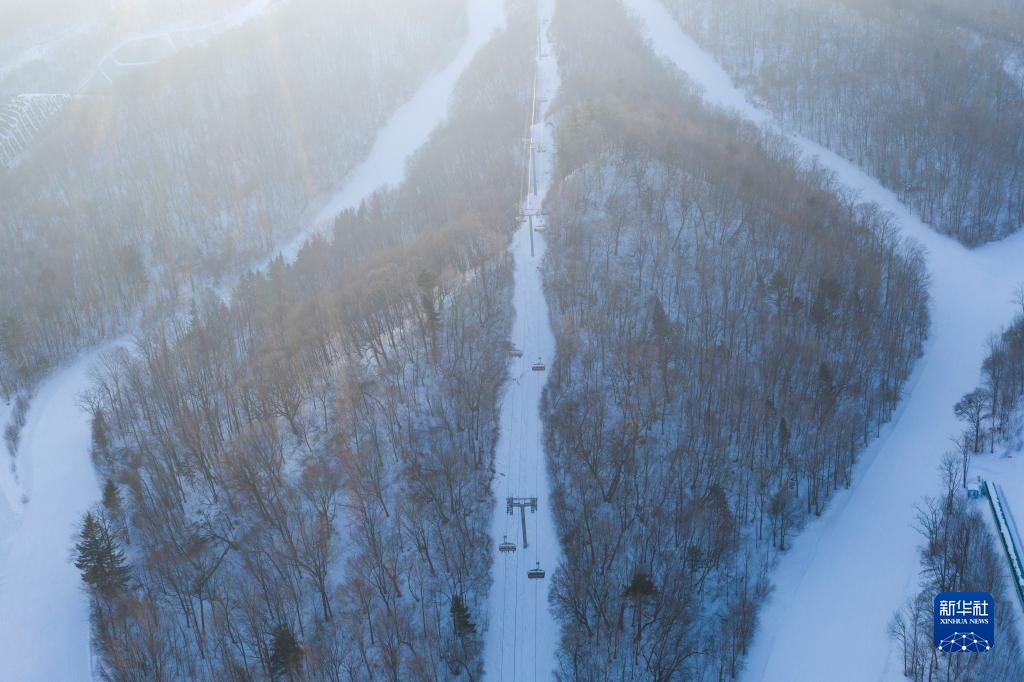 1月21日拍摄的黑龙江省亚布力滑雪旅游度假区的缆车和滑雪道(无人机照片)。