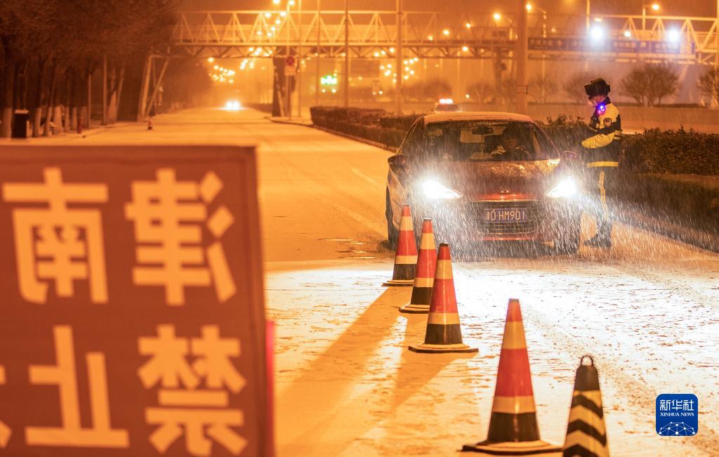 当日,天津出现降雪天气。天津公安铁骑护卫机动队骑警队员深夜坚守岗位,对进出天津市津南区的车辆进行信息及通行证核验,严把防疫关。