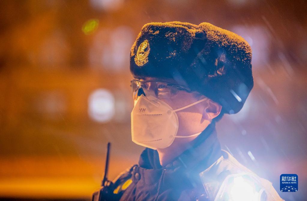 当日,天津出现降雪天气。天津公安铁骑护卫机动队骑警队员深夜坚守岗位,对进出天津市津南区的车辆进行信息及通行证核验,严把防疫关。